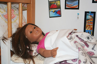 Neat freak that I am, I couldn't leave Zoe's bed in such disarray. I straightened the blanket and pillows and nestled her stuffed animals - including an adorable pink owl that a friend of ours brought back from Japan this summer (you can sort of see him in this picture) - amongst them.